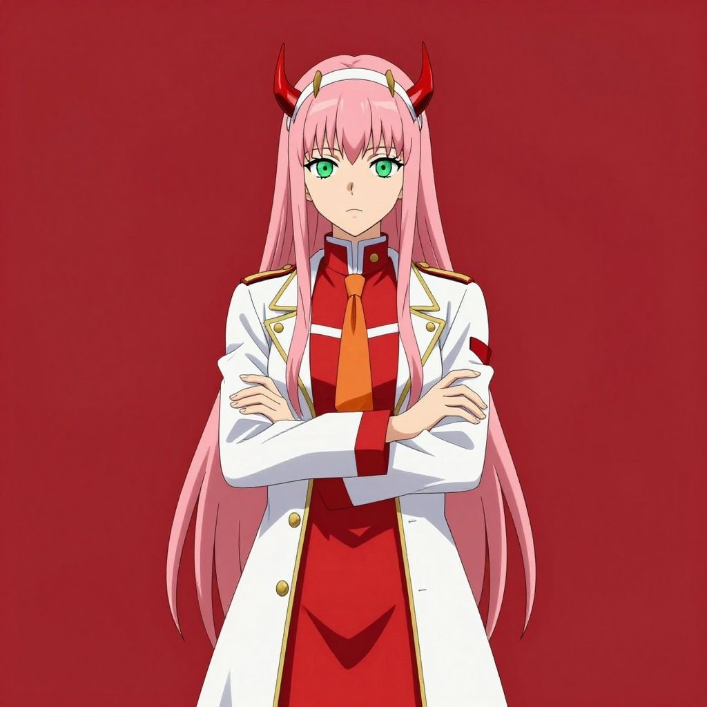 Zero two \(darling in the franxx\), darling in the franxx, 1girl, bangs, black eyeliner, blunt bangs, character name, closed mouth, coat, cowboy shot, crossed arms, dress, green eyes, hairband, horns, long hair, looking at viewer, military, military uniform, necktie, oni horns, orange necktie, pink hair, red background, red dress, red horns, simple background, solo, standing, straight-on, uniform, white coat