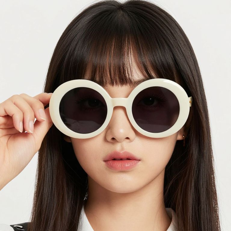 Photograph of an Asian woman with straight, black hair featuring blunt bangs, wearing large, white, round, black-tinted sunglasses. She has fair skin, full lips with pink lipstick, and a neutral expression. Her left hand is adjusting the sunglasses on her right temple. The background is a plain white, making her the focal point. She is wearing a white top, slightly visible at the bottom of the image. The image has a studio-quality, high-contrast, and sharply focused look, emphasizing her stylish eyewear and minimalistic makeup.