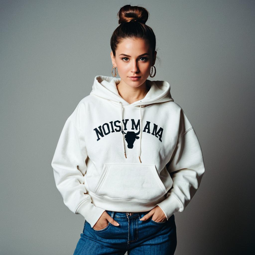 Portrait of a young white woman with brown hair styled in a high bun, wearing a white hoodie with 'NOISY MAMA' text and a bull graphic on the front. She is dressed in blue denim jeans and large hoop earrings, standing against a plain gray background with a calm expression and looking directly at the camera.