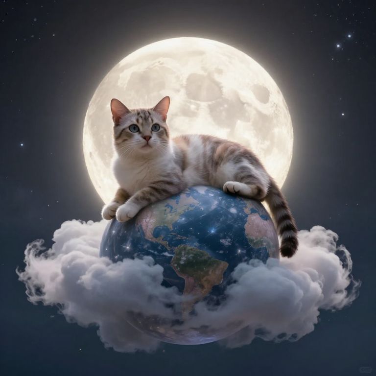 A serene cat rests atop a celestial sphere, cradled by clouds, with the luminous moon looming behind, defying gravity and reality in a dreamlike cosmic embrace.