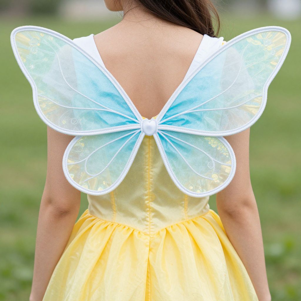Photograph of a young woman from behind, wearing a yellow, sleeveless, satin dress with a fitted bodice and a flared skirt. She has translucent, light blue fairy wings with white outlines, attached to her back with a white band. Her long, dark brown hair is loosely tied in a low ponytail. The background is a blurred, green grassy field, suggesting an outdoor setting. The fairy wings are semi-transparent with a subtle shimmer, adding a magical touch to her appearance. The image highlights the delicate and whimsical nature of the fairy wings against the bright yellow dress.