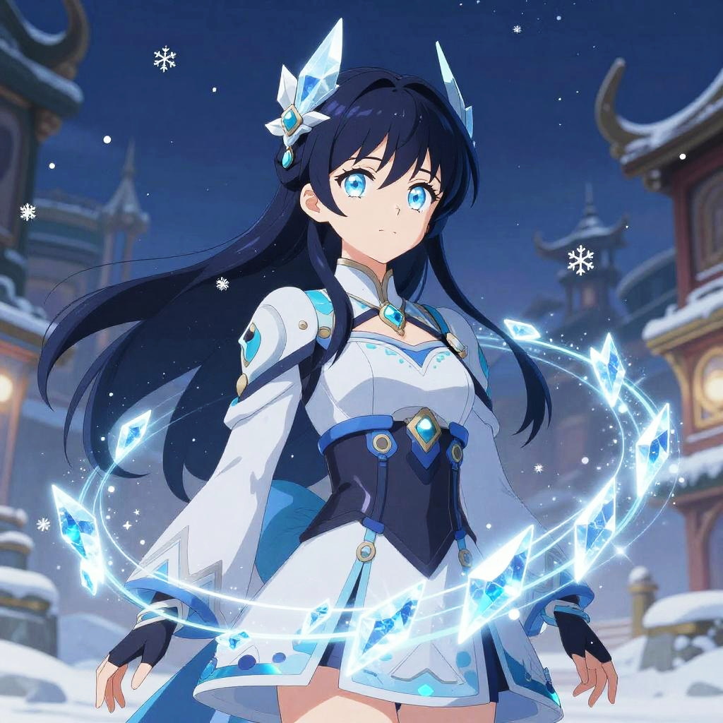 Ice anime characters girl in a fantasy winter city, her attire a mix of futuristic and traditional, glowing ice shards orbiting around her, icy blue eyes reflecting the cold light, delicate snowflakes falling softly, detailed anime-style artistry with vibrant colors.