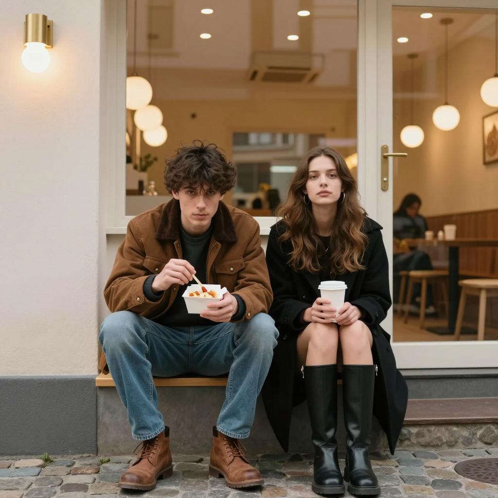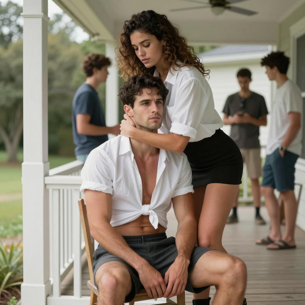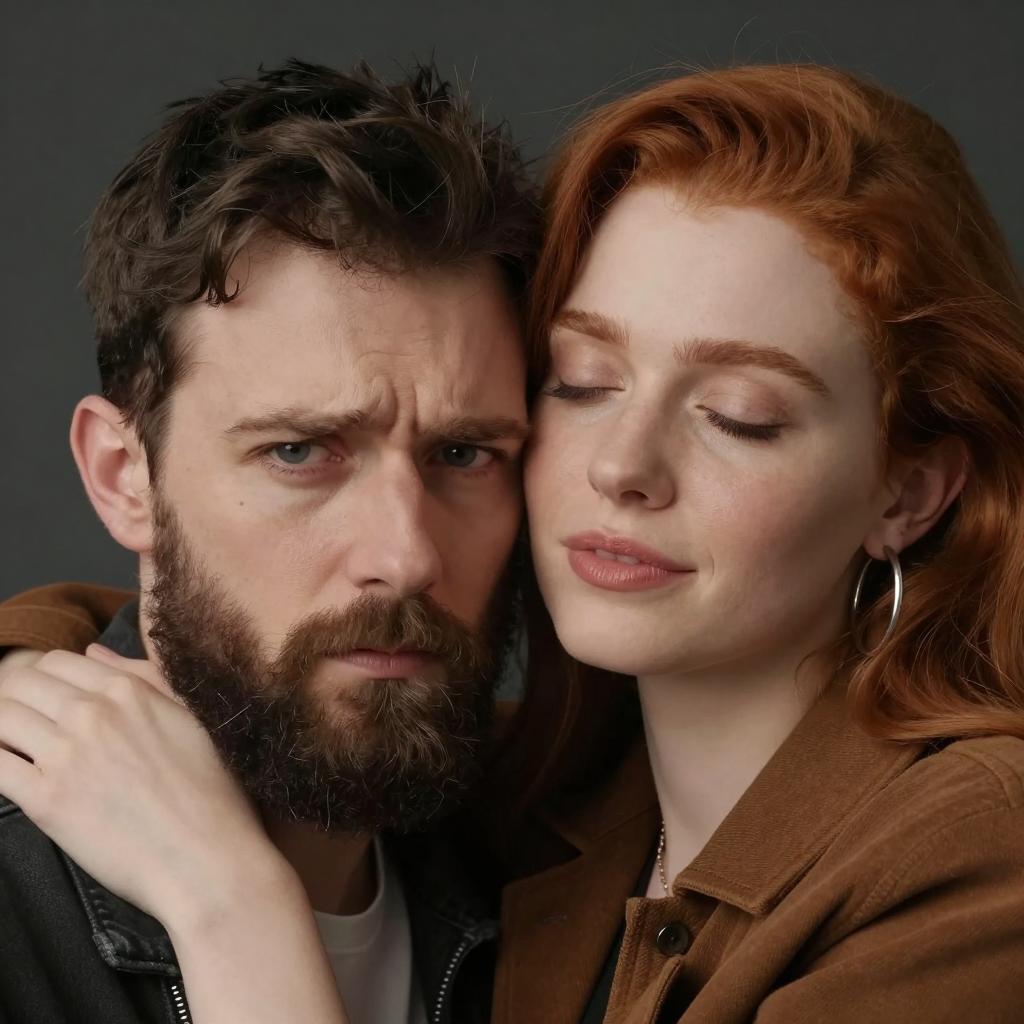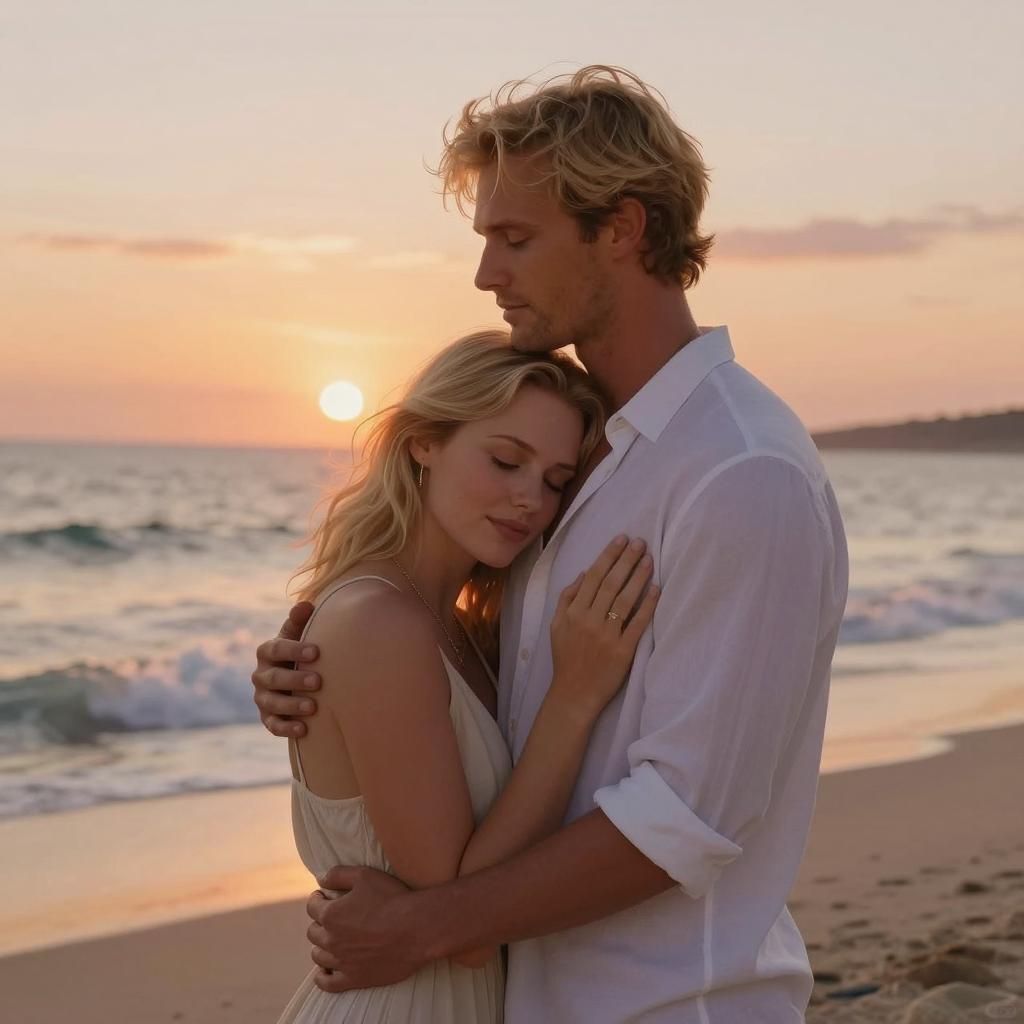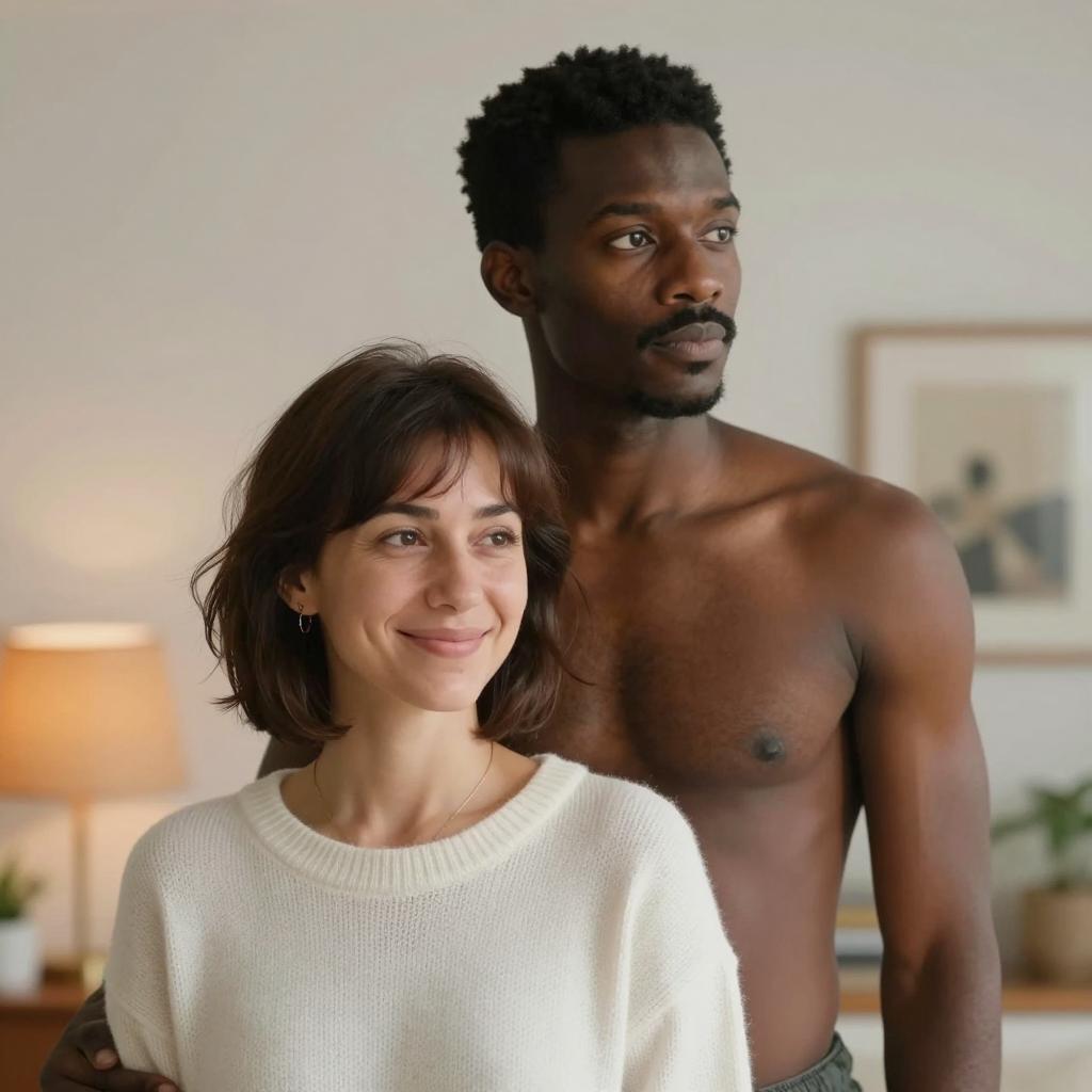 A young couple sits on a bed with a dark blue bedspread against a plain white background. The woman wears a bright pink off-shoulder dress with puffed sleeves and a necklace, displaying short brown hair. The man is dressed in a black shirt, plaid jacket, and white shorts, sitting with his eyes closed and one hand on his chest. Soft lighting from four wall-mounted lamps adds a warm ambiance to the scene.