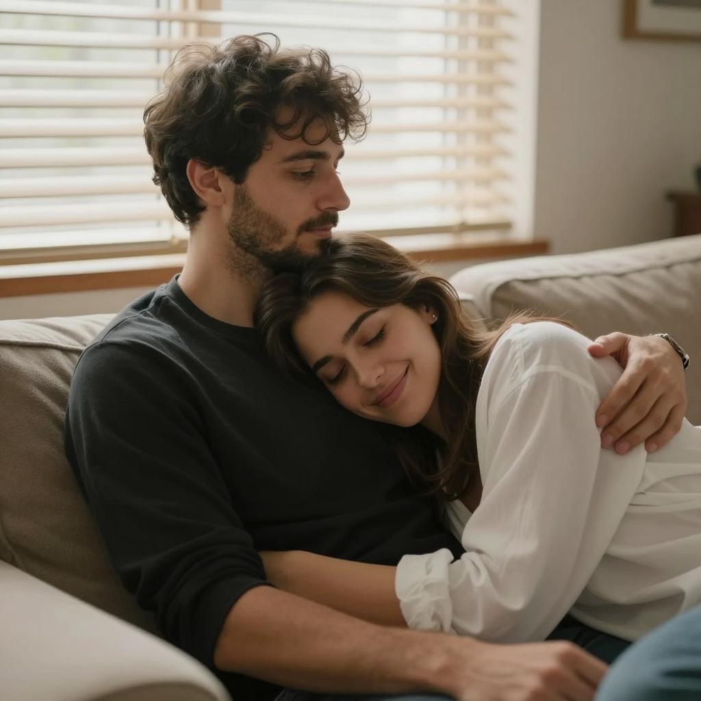 Two people sitting on a bed. Woman in bright pink off-shoulder dress with puffed sleeves, necklace, and short brown hair. Man in black shirt, plaid jacket, white shorts, leaning back with eyes closed. Soft lighting from four wall-mounted lamps. Dark blue bedspread. Background wall is plain white. Woman's right hand on her lap, man's left hand on his chest. Both relaxed.