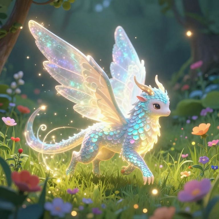 Bienos creature roaming an enchanted meadow, ethereal wings and shimmering scales, magical aura glowing softly, surrounded by floating lights, detailed fantasy art with lush greenery and colorful flowers