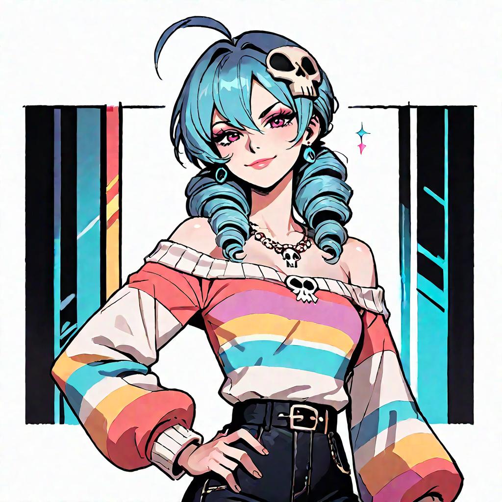 Score_9, score_8_up, score_7_up, source_anime, solo, 1girl, zone-tan, smile, looking at viewer, hand in pocket, ahoge, hair over one eye, drill hair, skull hair ornament, purple hoodie, black pants, outdoors