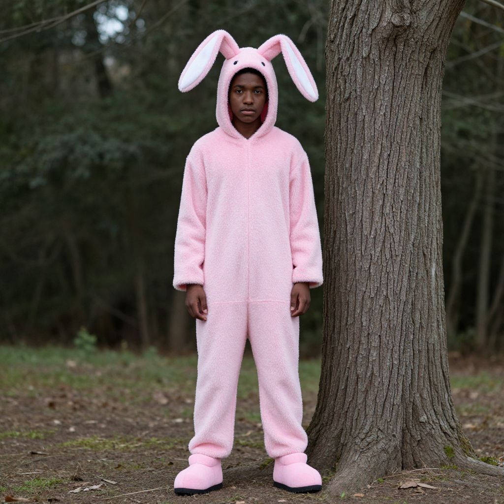Pink peep costume, solo, outdoors, 1boy, tree, male focus, shoes, standing, hood, pink footwear, full body, cosplay, realistic, rabbit costume, dark skin, kigurumi