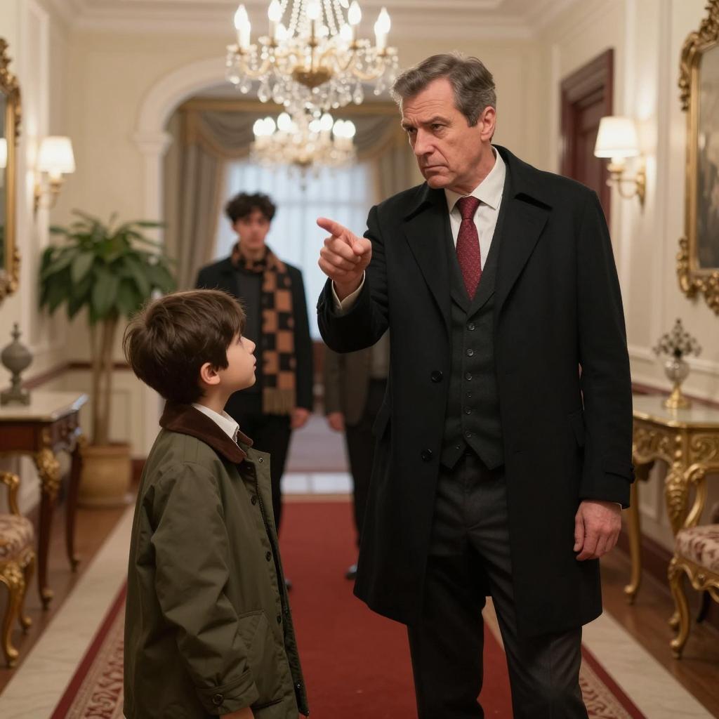 Photograph of a formal dinner scene. Six people seated around a table with a roasted turkey centerpiece. Man in dark cardigan and green tie stands, speaking. Elegant wallpaper, china on shelves, wine bottles, glasses, and floral decorations. Intense expressions on faces.