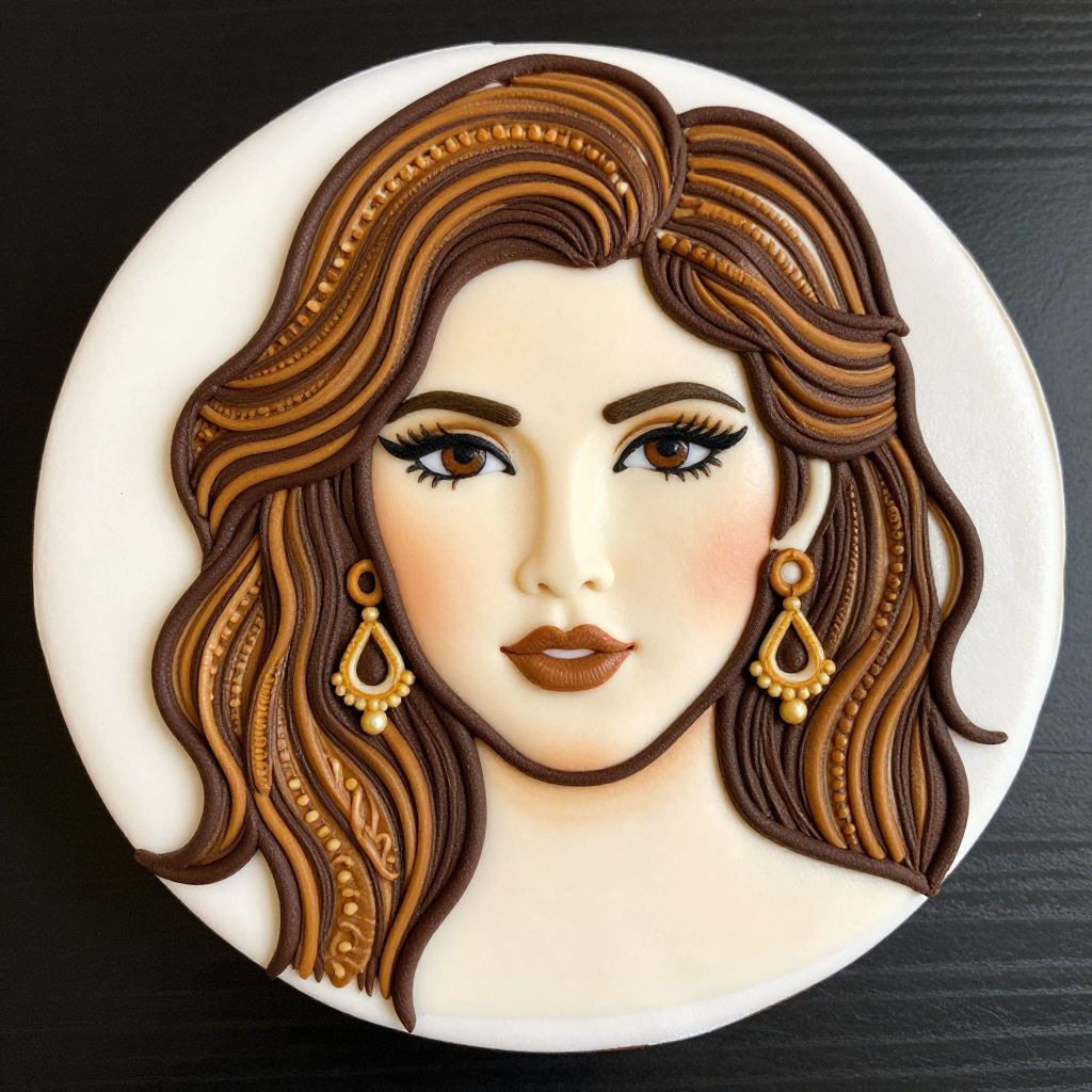 Photorealistic cake portrait of a woman with wavy brown hair, dark lipstick, and teardrop earrings, set against a white circular background.