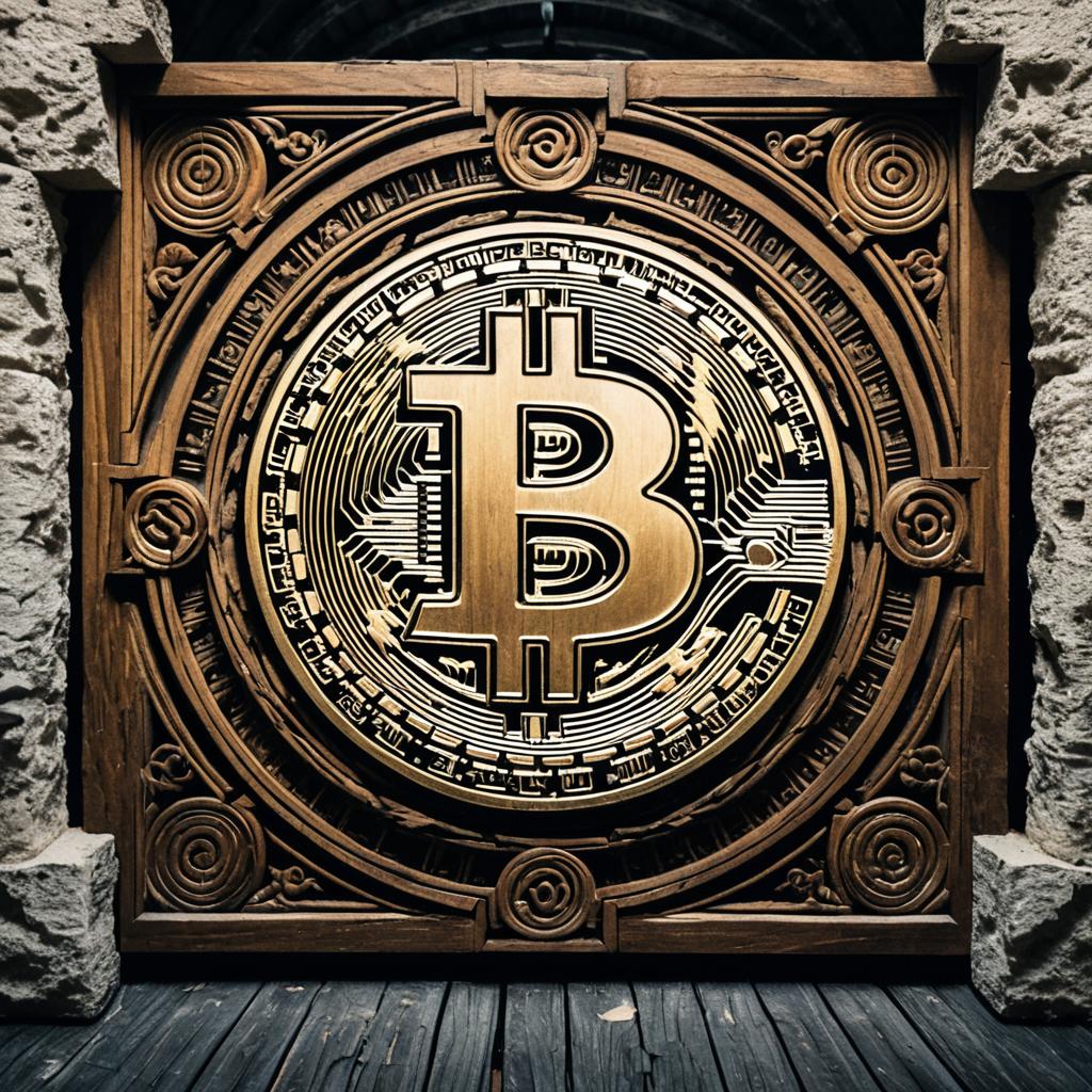 Intricately carved wooden bas-relief artwork featuring the Bitcoin logo at the center, surrounded by mythical beast motifs and circuit-like code patterns, styled as an ancient artifact. The detailed craftsmanship highlights a fusion of modern cryptocurrency symbolism with traditional mythical and geometric designs.