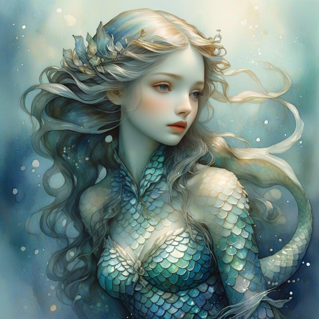 Full body portrait of a graceful mermaid in shimmering scales, depicted in ethereal watercolor style with soft, ambient lighting, rich textures. The artwork is reminiscent of Brian Froud, Arthur Rackham.