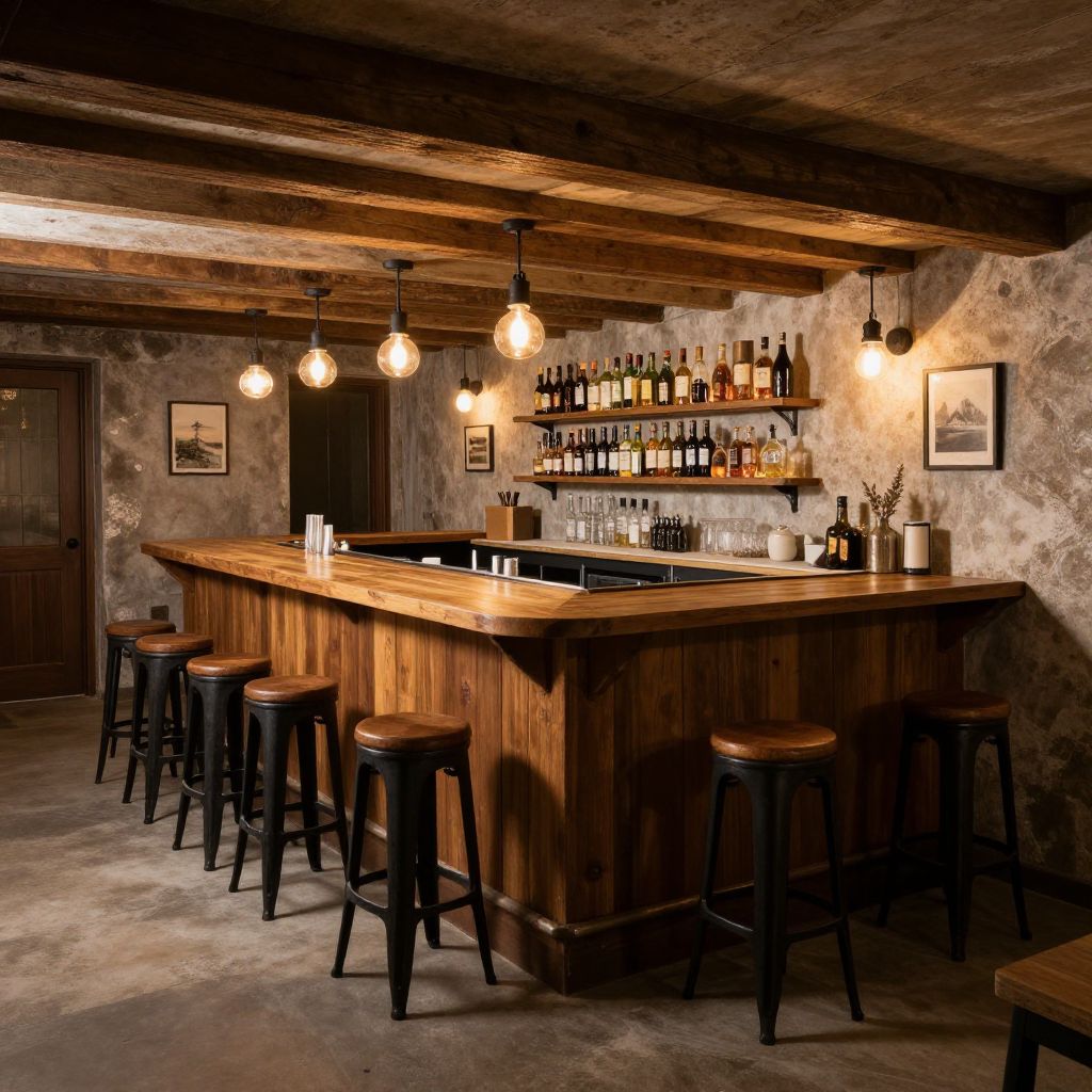 Photograph of a rustic bar with a wooden countertop and six black, round-backed stools. Exposed wooden beams run across the ceiling, and warm, exposed light bulbs hang above the bar. The background features a stone wall with shelves holding various bottles of liquor, glasses, and small decorative items. Two framed pictures hang on the wall. The floor is concrete, adding to the rustic ambiance. The overall lighting is warm and inviting, creating a cozy atmosphere.