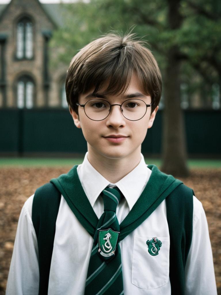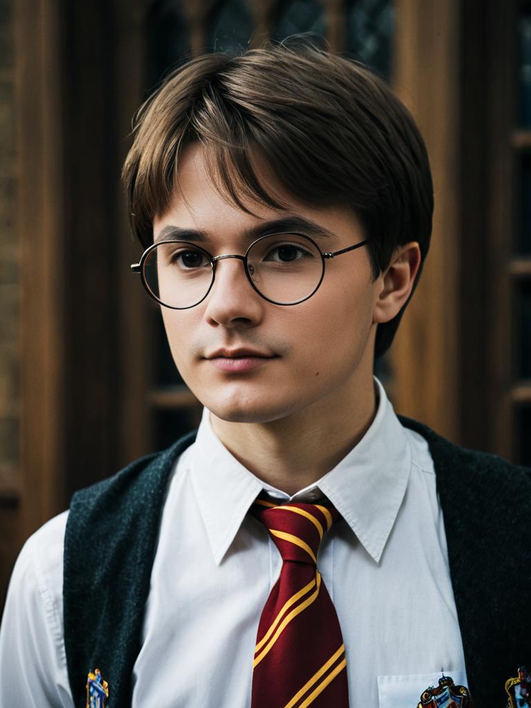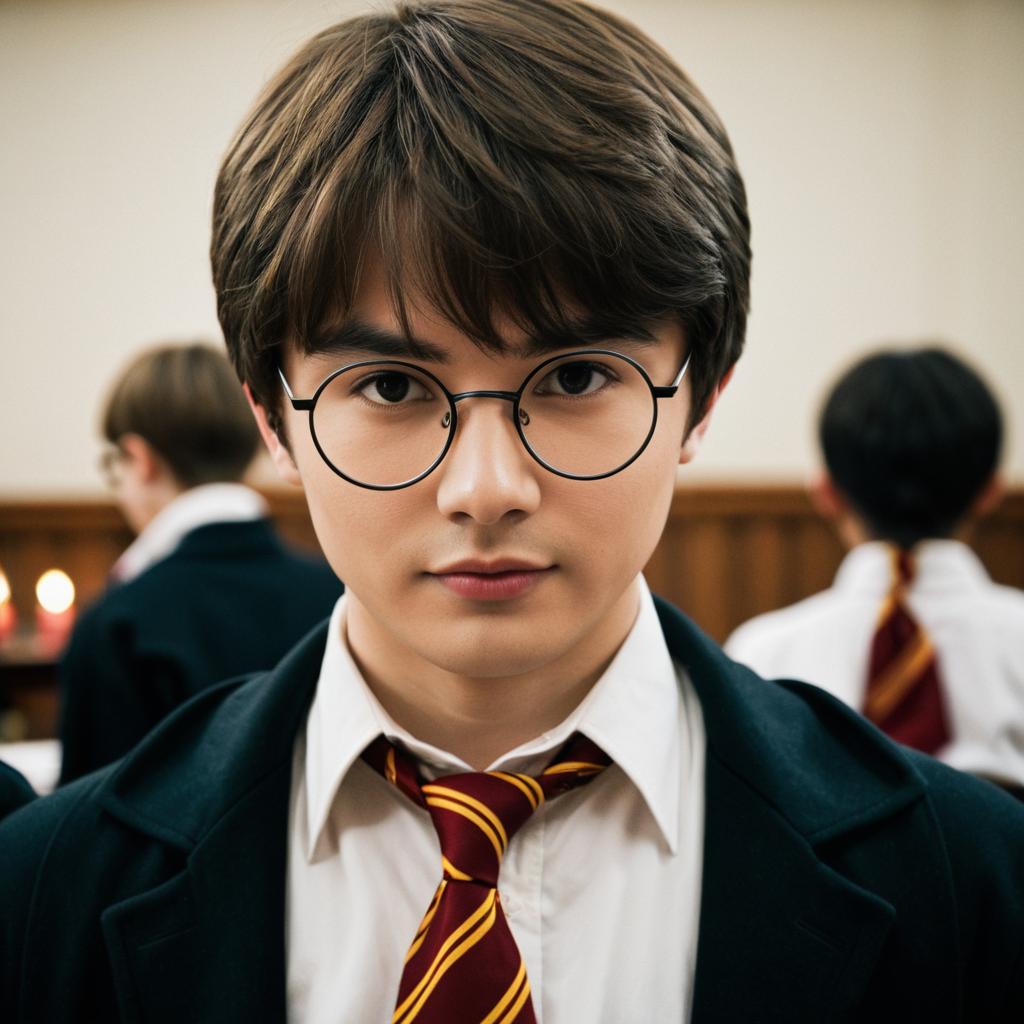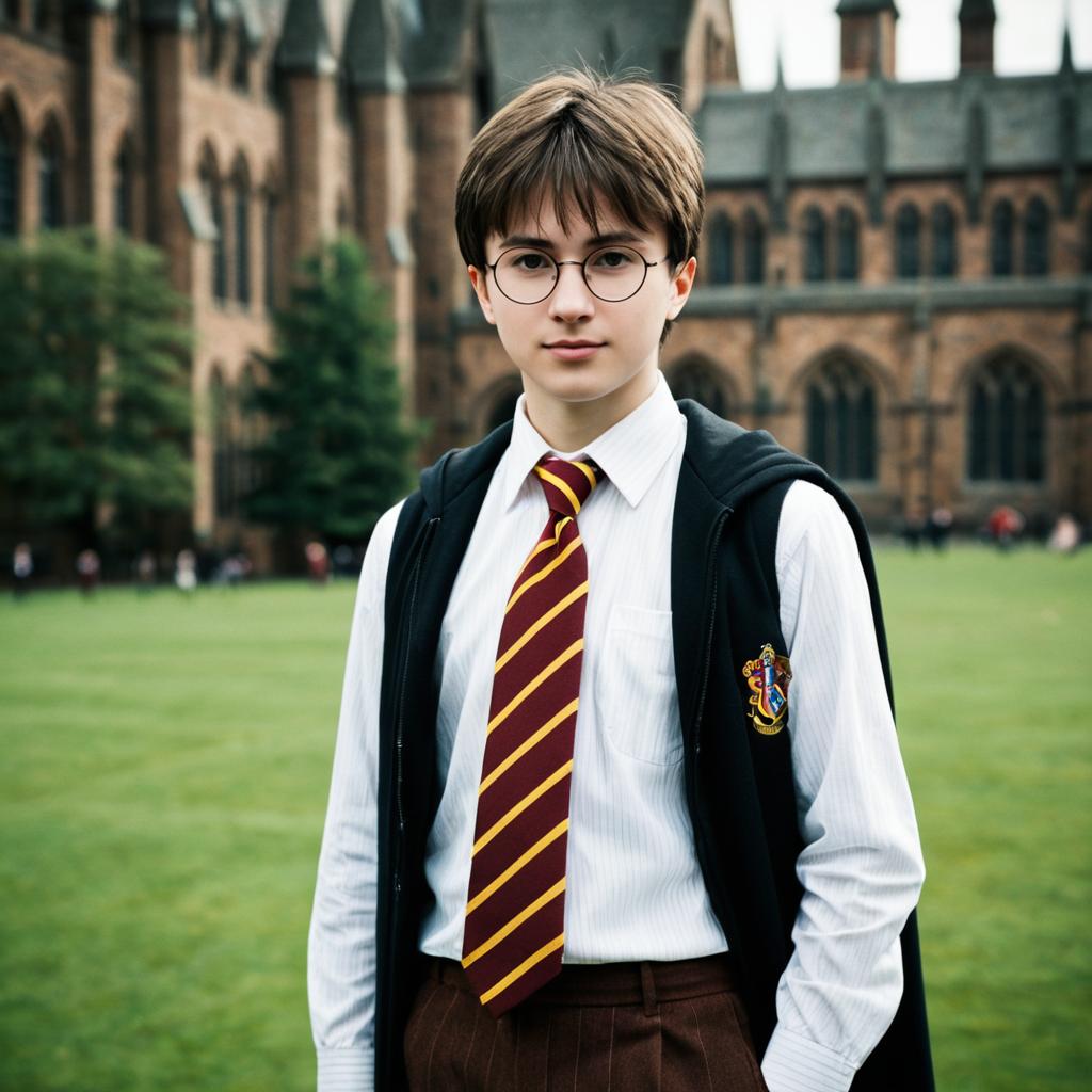 Portrait of a young male wearing a realistic Hogwarts school uniform costume, featuring a white collared shirt, a red and yellow striped necktie, a dark vest with house crests, and round eyeglasses. The subject has short brown hair, brown eyes, and a neutral expression, standing against a softly blurred background.