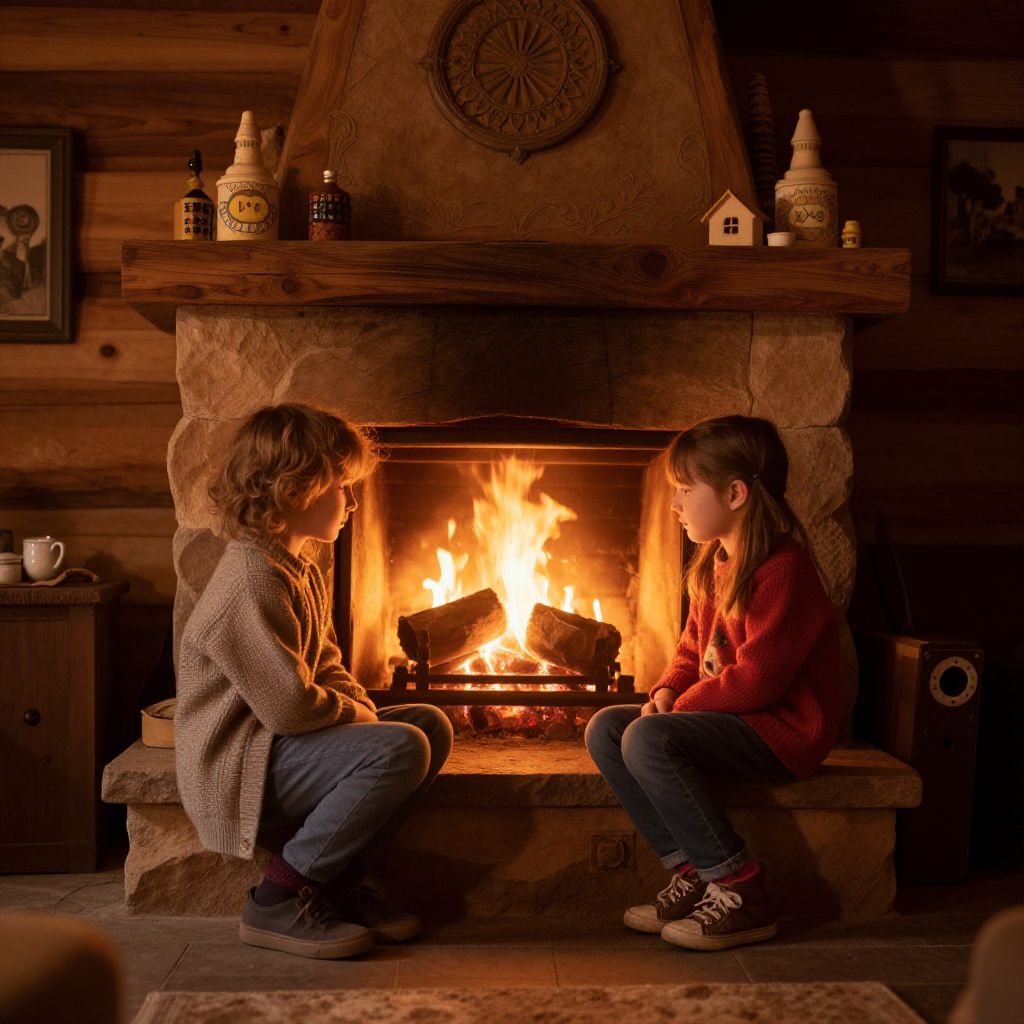 Fraternal siblings sitting by a cozy fireplace, warm and inviting atmosphere, rustic cabin interior, soft shadows, intricate details on wooden textures, childhood memorabilia surrounding, emotional and heartfelt moment, hyper-detailed realism