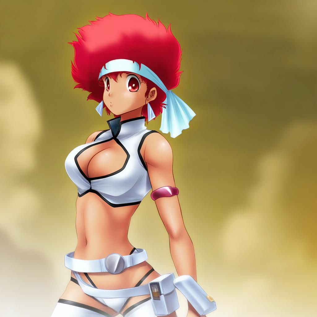 Digital anime-style illustration of a dark-skinned female character with bright red short hair, red eyes, and a light blue headband. She is wearing a white crop top with black trim, a matching white belt, and minimal white clothing. The character has large breasts and visible cleavage, with a confident and slightly pouty expression. The background features a muted yellowish-brown gradient with soft cloud shapes.