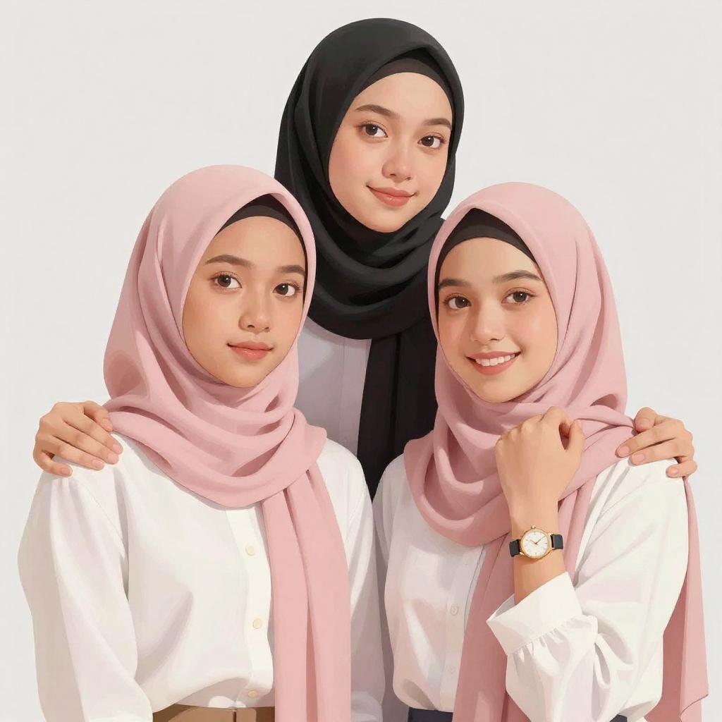 Digital illustration of three young women with light skin, wearing hijabs. The woman in the back has a black hijab and white shirt, smiling softly. The woman in the middle has a pink hijab and white shirt, looking forward. The woman in the front has a pink hijab, white shirt, and a wristwatch, smiling warmly while resting her hand on the middle woman's shoulder.