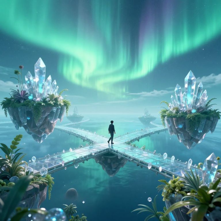 Diisuke walking through a floating island with bridges made of crystal and floating plants, sky filled with auroras, dreamlike setting, surreal and ethereal, wide-angle view