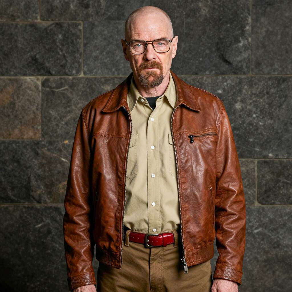 Breaking bad costume, photograph of bald middle-aged man with glasses, brown leather jacket, beige button-up shirt, brown pants, red belt, standing against dark stone wall, serious expression, studio lighting, realistic, professional portrait, medium close-up, casual attire, neutral background