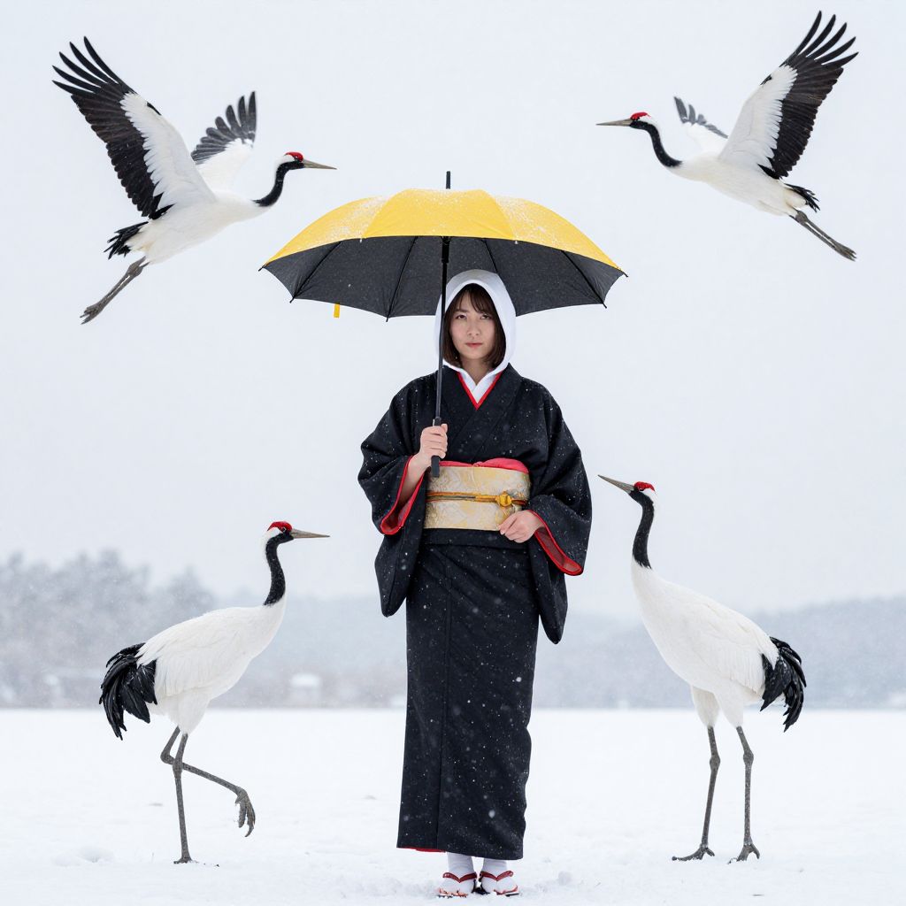 Standing woman wearing while kimono with red lining; black obi; woman wears a white hood; woman holds a yellow and black umbrella; three cranes --two flying in URQ, one beside woman in LLQ; snow falling