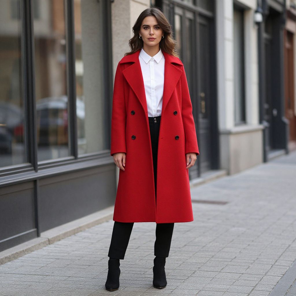 Photograph of a confident woman with wavy brown hair, wearing a vivid red double-breasted coat, white shirt, black pants, and black boots