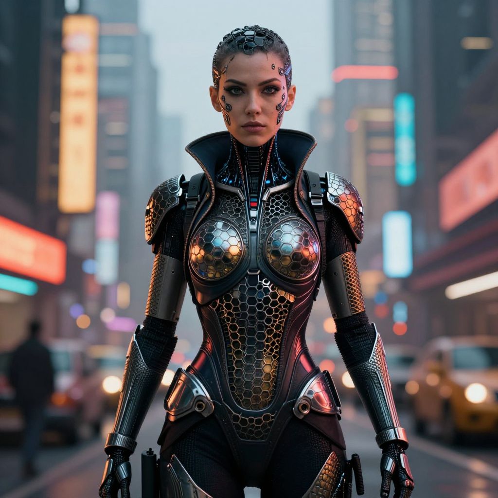 In this hyper-realistic, 4k, futuristic sci-fi city environment, a cybernetic cyberpunk woman stands as the focal point, her intricate hexagon-patterned filigree attire and face artistry by an original stylist capturing the essence of the cyberpunk aesthetic. The hexagon accents on her clothing and face are meticulously detailed, reflecting a blend of technology and nature, with a striking contrast of dark and metallic hues. The background is a vibrant bokeh of warm and cool colors, creating a sense of depth and distance, while the woman's gaze is directed forward, exuding a sense of determination and resilience. The overall composition is dynamic, with the woman's figure centrally positioned, drawing the viewer's eye to the intricate details of her attire and the vibrant cityscape behind her.