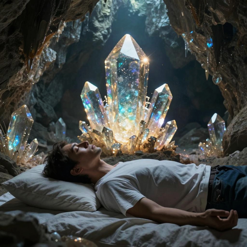 One young man laying flat on a bed meditating and imagining a glowing crystal cave with iridescent gems reflecting mystical light, the scene looks spiritual, dreamy, and magical, with a cinematic ultra-realistic rendering in 8k, dramatic lighting, extreme detail.