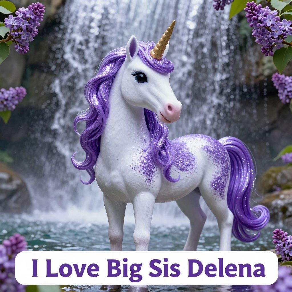 Beautiful unicorn, purple glitter surrounding it, background water fall and purple lilacs, (ultra detailed), (ultra realistic), RAW photo, HDR, photorealistic, 8k, high res, extremely detailed (banner at the bottom thats said I Love Big Sis Delena)