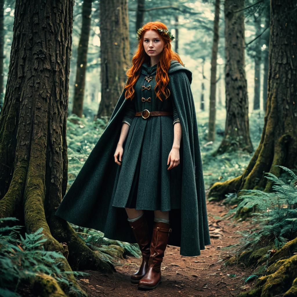 Beautiful visual novel character illustration of a freckled red-haired Celtic woman, wearing a medieval leather and wool dress with intricate embroidery, standing in a misty green forest near an ancient stone circle, cell-shaded, anime-inspired.