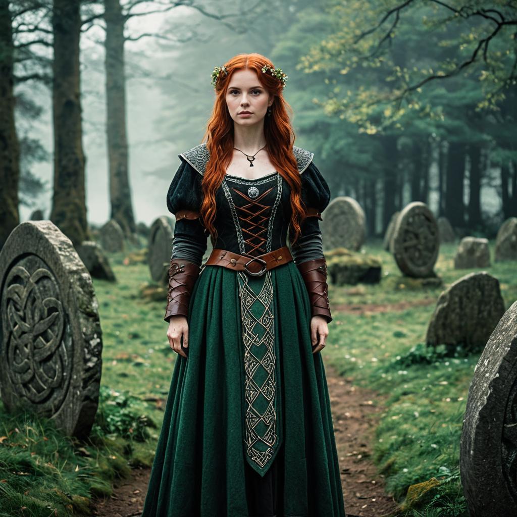 A freckled red-haired woman dressed in a medieval leather and wool dress with intricate Celtic embroidery stands in a misty green forest surrounded by ancient stone circle monuments. The atmosphere is mysterious and ethereal with lush greenery and foggy woods in the background.