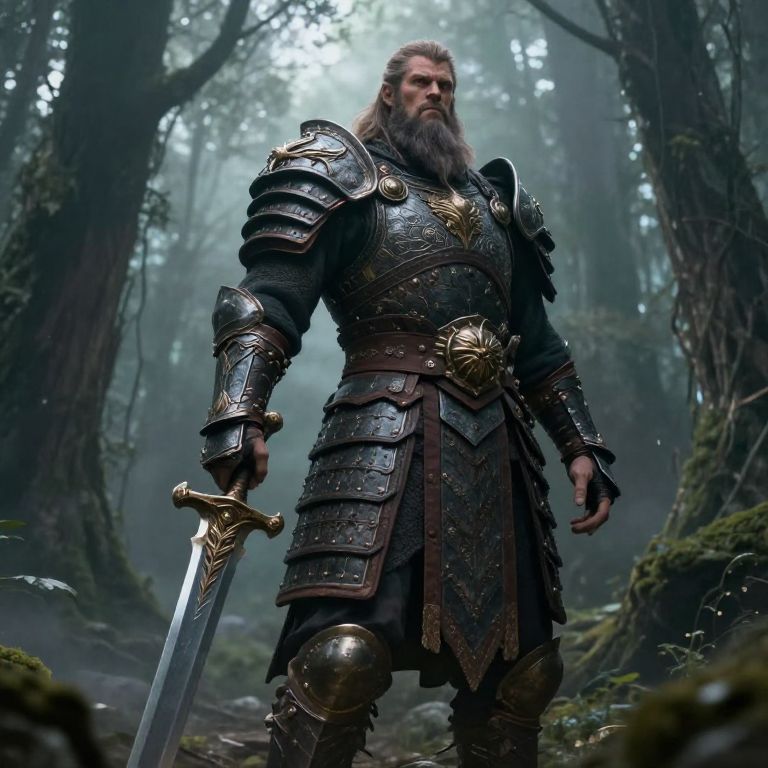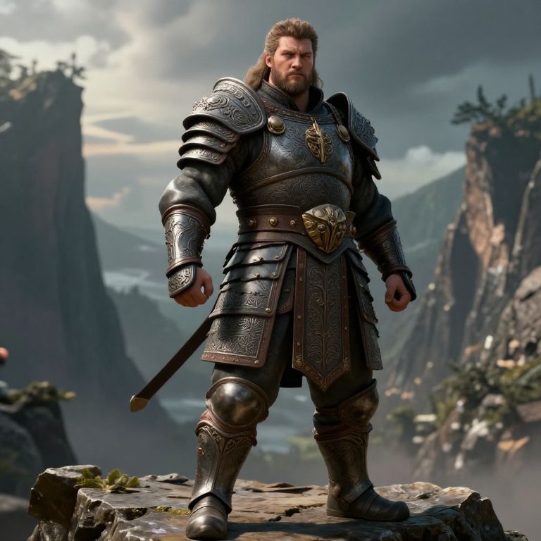 Thickthighs depicted in a fantasy warrior theme, clad in ancient armor with intricate engravings, standing strong on a rocky cliff overlooking a mystical landscape, with dramatic lighting emphasizing power and resilience.