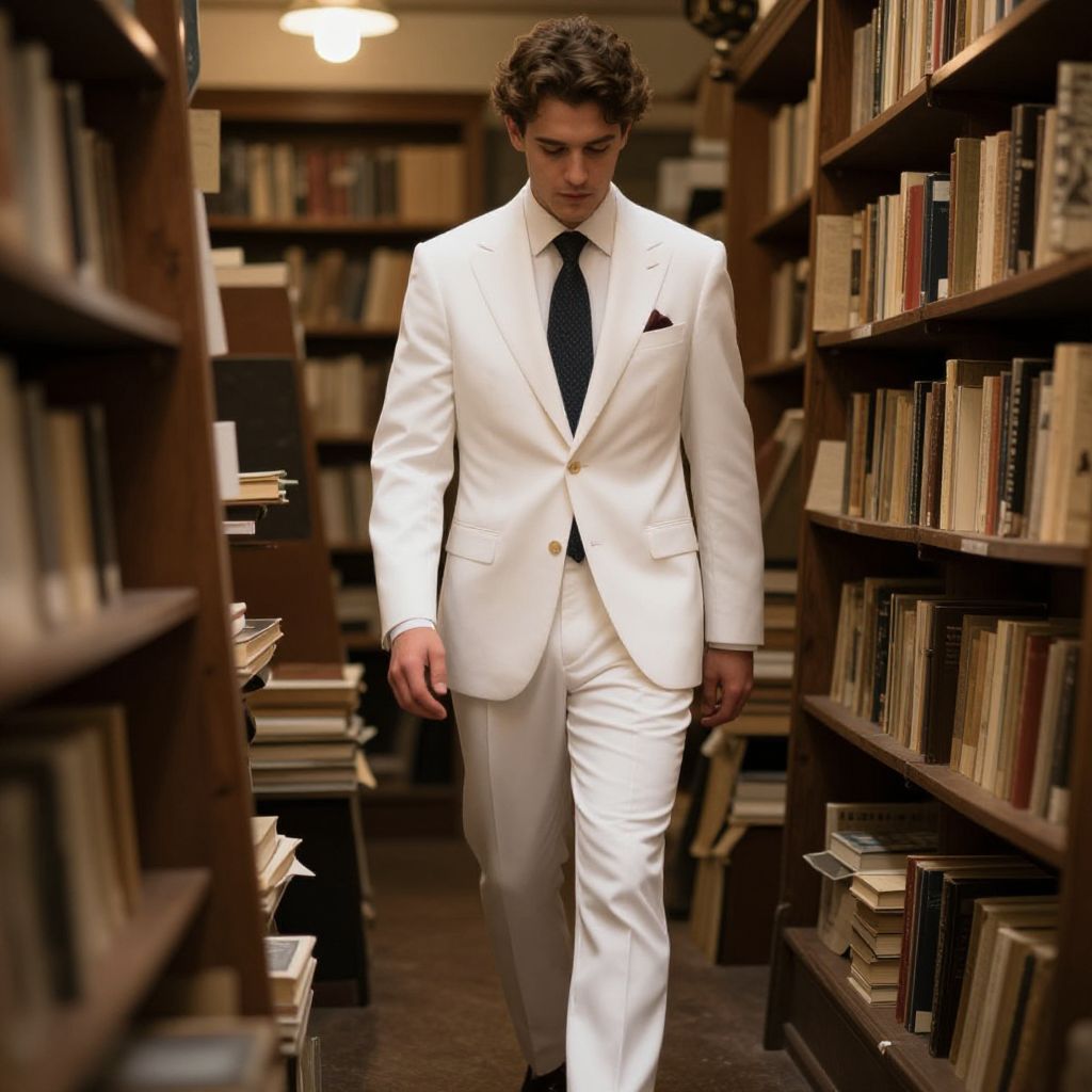 A suit photo prompt of a young man in a crisp white suit walking through a vintage bookstore, warm indoor lighting, textured surfaces, shallow depth of field, nostalgic atmosphere, realistic detail.