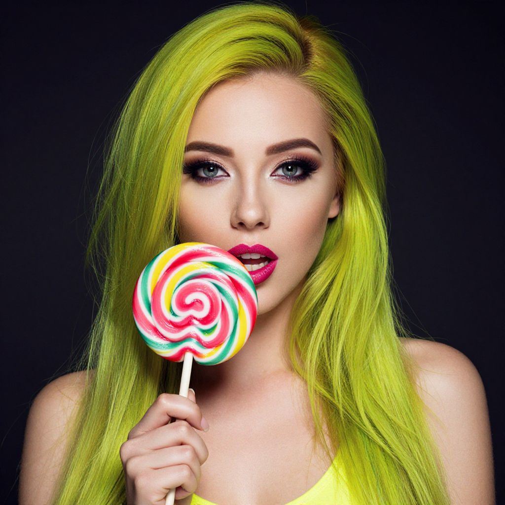 A woman with vibrant, neon-colored hair and makeup holds a large, intricately designed lollipop with a spiral pattern, set against a dark background.