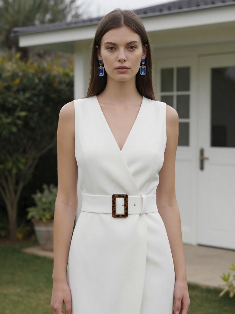 A Slim woman in a minimalist chic, white sleeveless wrap-style dress with a V-neckline and fitted waist, standing at a seaside cottage with a garden. The dress features a rectangular tortoiseshell buckle belt and a simple cut, complemented by a straight hairstyle and rectangular drop earrings with blue gemstones. Captured in a pinhole camera style. Sexy. Pretty face and beаutiful eyes. Big breasts