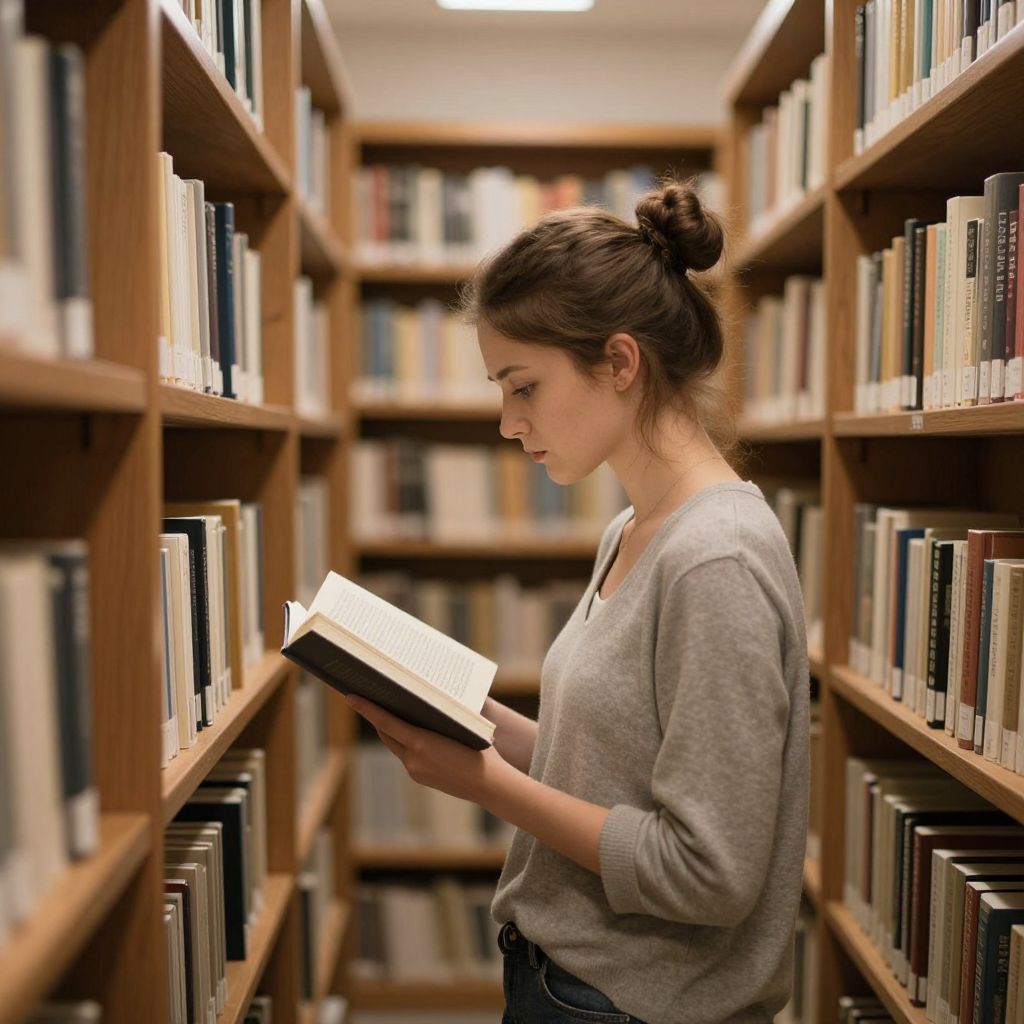 Focused light illuminates a serene library scene where a young woman, her hair tied in a neat bun, stands between tall wooden bookshelves filled with countless volumes, engrossed in reading an open book held gently in her hands.