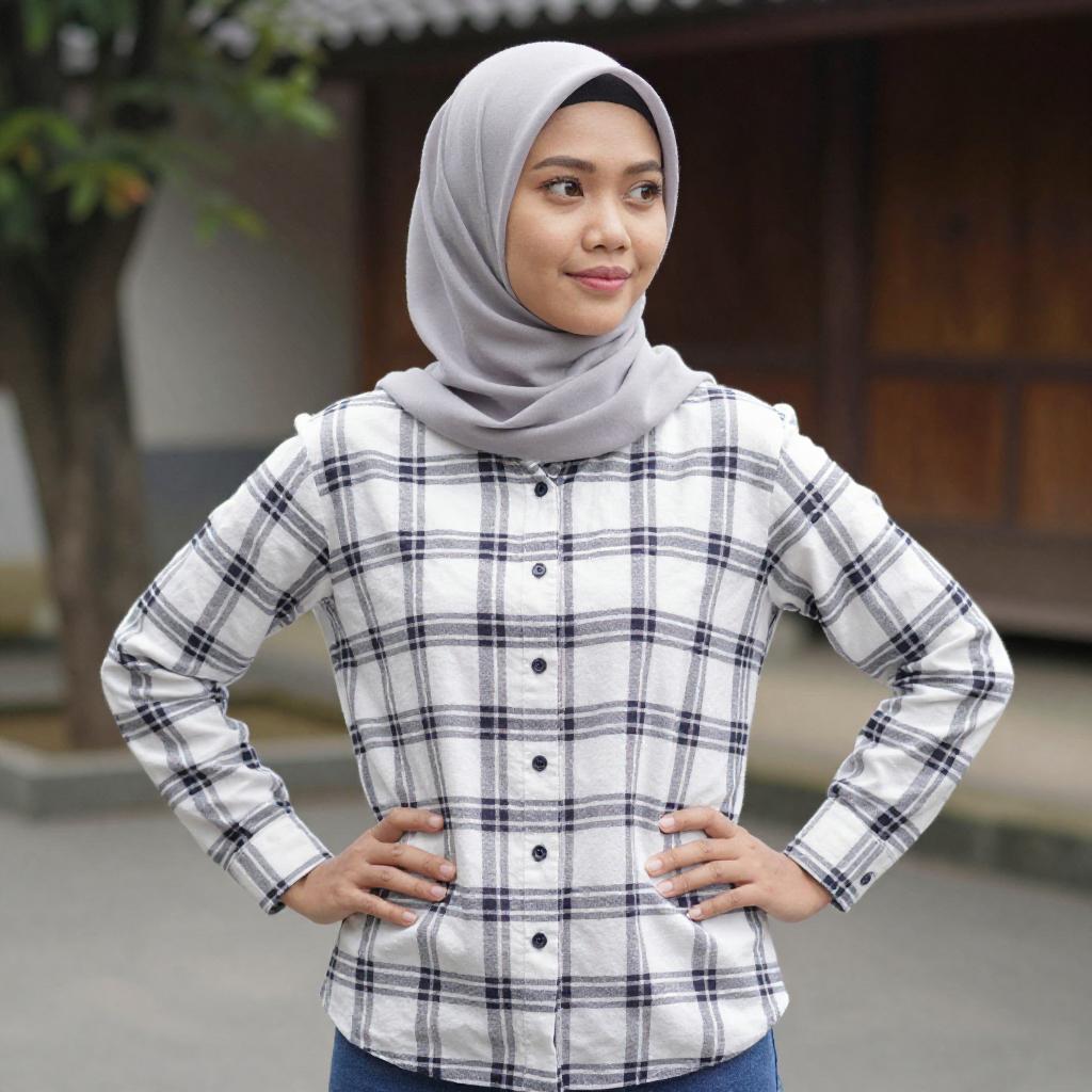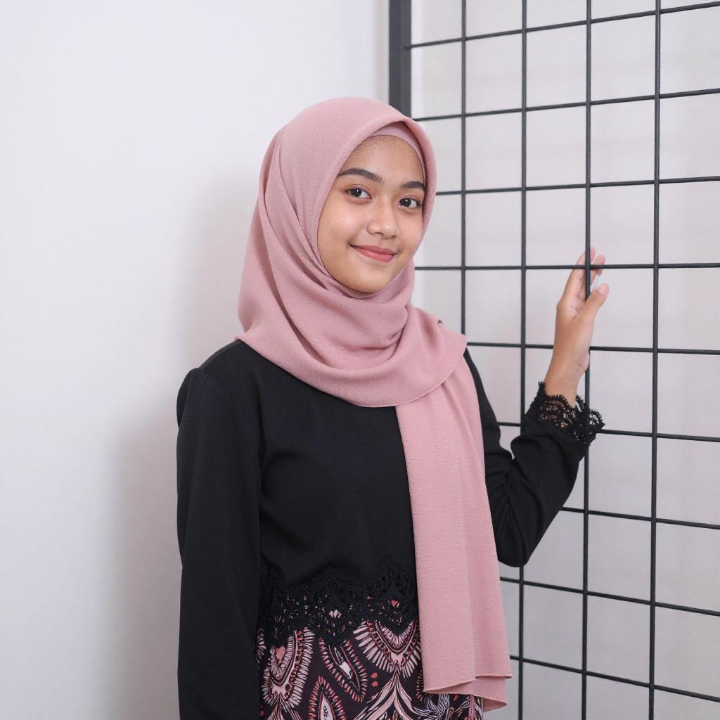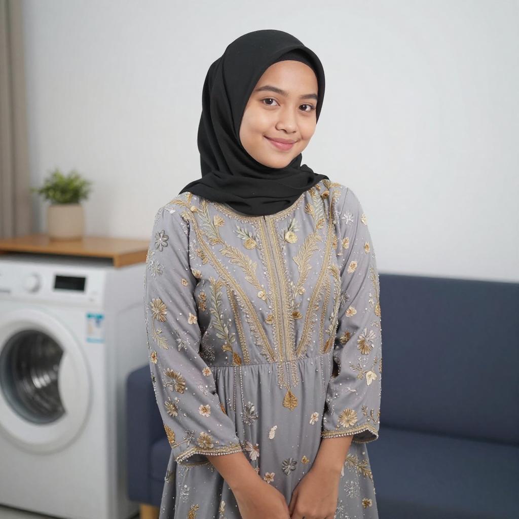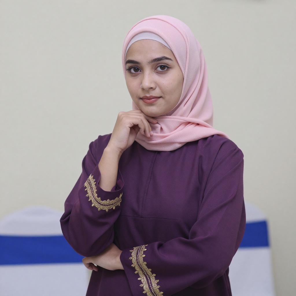 Photograph of a woman with light skin and brown eyes, wearing a pink hijab and a blue satin Baju Kurung with pink trim and gold buttons. She sits on a white stool, right hand raised, left hand resting on her lap, against a dark background with a bright white vertical light on the left.