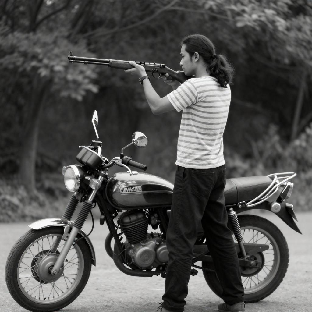 Black-and-white photograph of a shirtless man riding a motorcycle on a narrow, tree-lined road. He is in the foreground, centered, with a second motorcycle and rider in the background. The road has double white lines and is flanked by dense foliage. The man has short hair and a focused expression.
