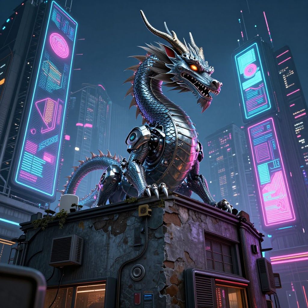 A futuristic cyberpunk scene emerges with a neon-lit street corner, blending the elegance of ancient dragons from Eastern mythology with the gritty, post-apocalyptic feel of cutting-edge technology. A sleek anthropomorphic dragon hybrid stands atop a weathered building, its metallic scales shimmering under the glow of holographic billboards that seamlessly merge organic and mechanical elements. From a low-angle perspective, the camera captures the dragon's piercing gaze as it surveys the bustling cityscape below, contrasting its ancient wisdom with modern technological advancements in an emotionally rich environment that reflects humanity's evolution amidst a backdrop of advanced digital artwork.