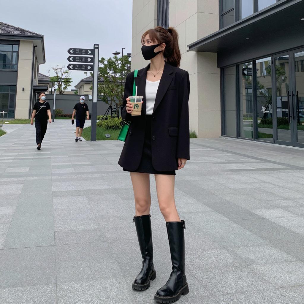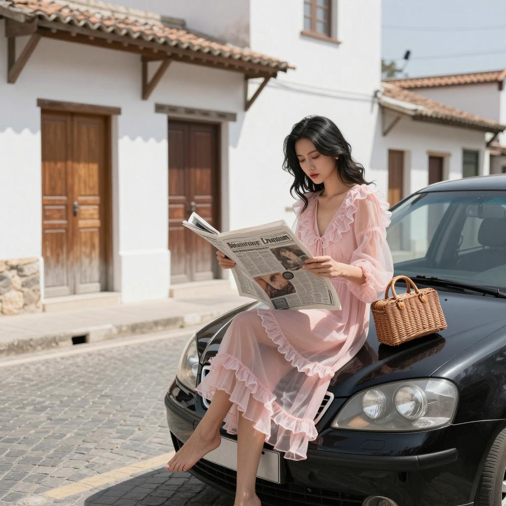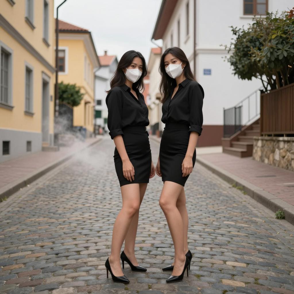 Two women in black outfits and white face masks stand on a steep, cobblestone street. Both wear black skirts and black high heels, with the woman on the left slightly leaning into the other. Steam rises from the street in the background. Buildings with yellow and white facades line both sides. A wooden staircase and a bush are in the upper right.