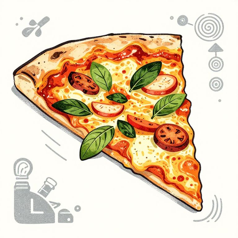 Colorful digital drawing of a slice of pizza with tomato, cheese, and basil, angled to the right, on a white background with gray circular patterns