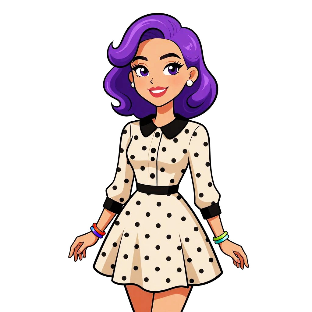 Digital illustration of a stylish woman with purple hair, wearing a white polka dot dress, gold earrings, and red-trimmed collar. She stands
