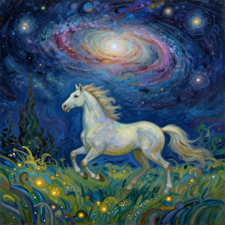 Envision an intricately detailed portrait showcasing a mystical creature gracefully galloping across a serene landscape under a vibrant night sky filled with swirling galaxies and cosmic phenomena. This captivating scene is captured from a unique 'bird's-eye view', emphasizing the enchanting interplay between the celestial canvas above and the lush, illuminated meadows below. The artwork is characterized by fluid, expressive brushstrokes reminiscent of Van Gogh's iconic style, evoking a sense of wonder, tranquility, and ethereal beauty as viewers embark on a mesmerizing journey through a fantastical dreamscape where nature and cosmic wonders intertwine in harmony.