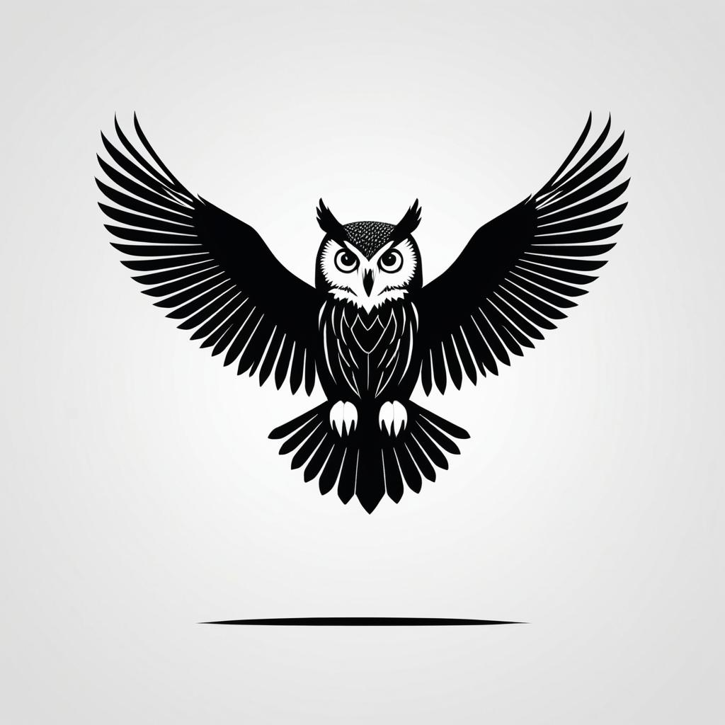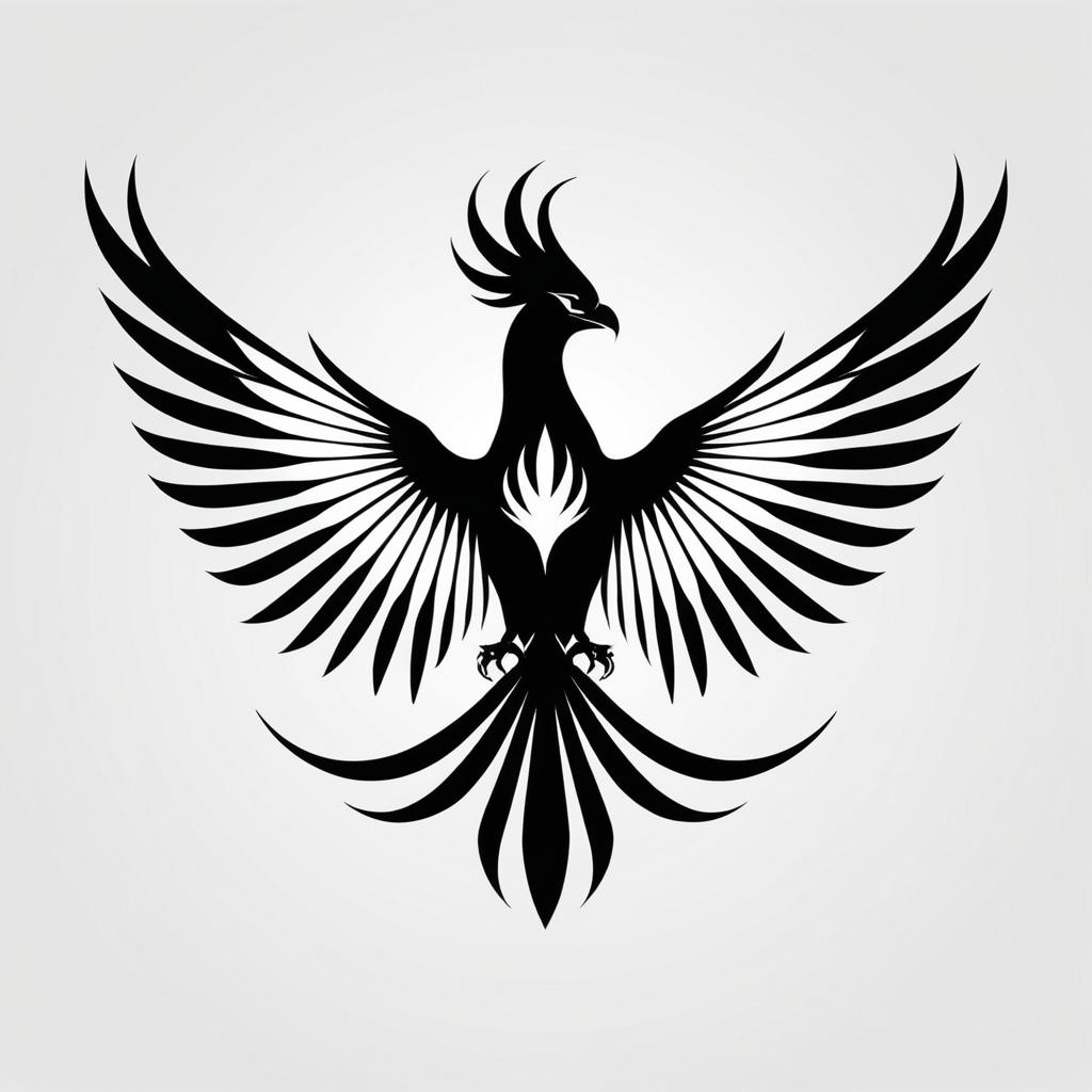 Black and white, minimalist logo-style design of a phoenix with fiery wings and tail feathers, rising from flames in a flat, geometric style suitable for two-color printing, clean and modern aesthetic