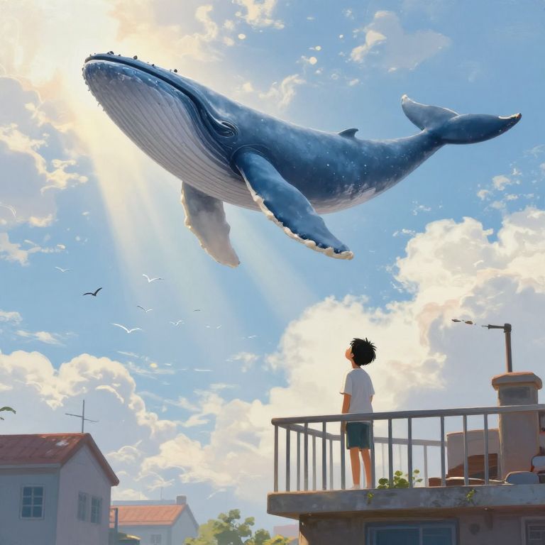 A surreal painting of a boy with black hair on a balcony on a rooftop looking up into the sky where a giant blue whale flies overhead through the clouds and godrays of sunshine and a flock of birds flying by