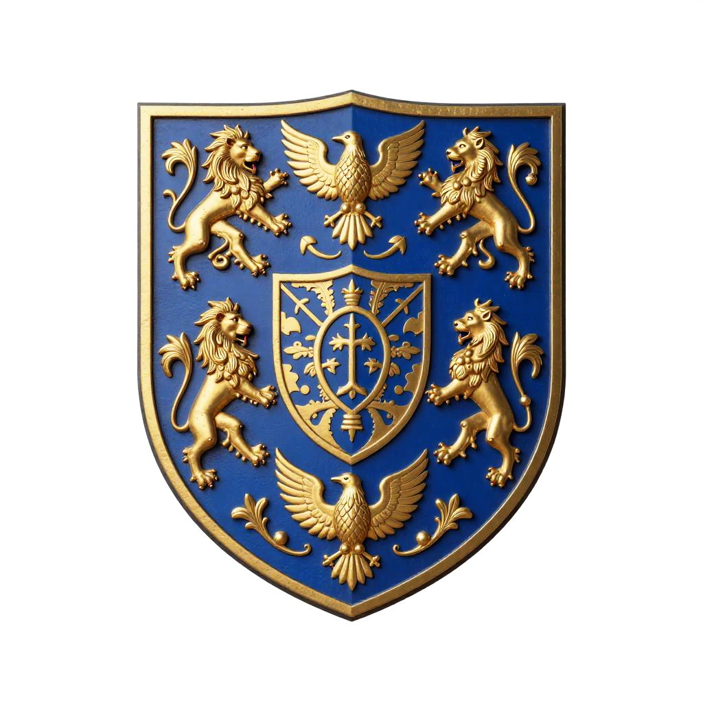 Maurer family crest, detailed medieval heraldic shield with intricate gold and blue patterns, ornate lion and eagle symbols, vintage style, high resolution