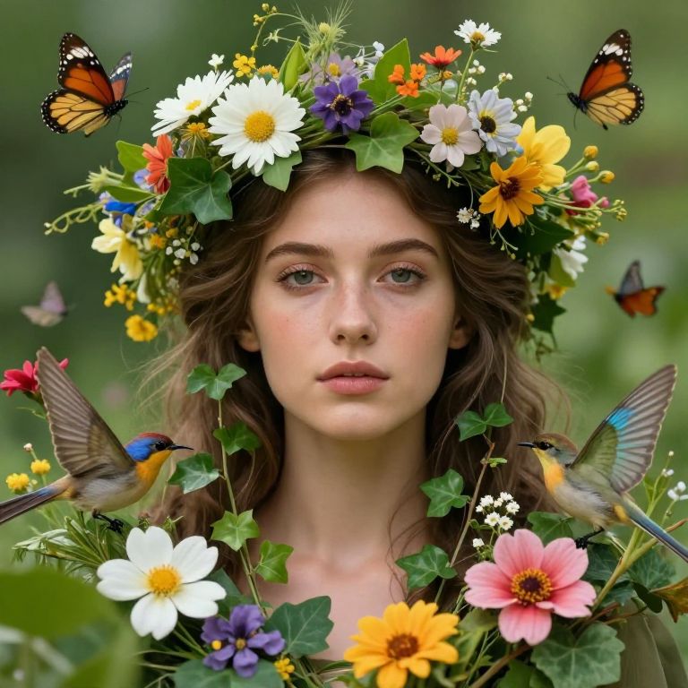 Photograph of a young woman with fair skin and brown wavy hair, wearing a vibrant floral crown adorned with white, yellow, purple, and orange flowers, surrounded by green leaves. Her calm, neutral expression contrasts with the lively scene. Three colorful butterflies and two hummingbirds with iridescent feathers hover around her. The background is a blurred, green natural setting. The woman's face is centered, with flowers and birds creating a symmetrical, enchanting frame around her. The image is bright and detailed, emphasizing the natural beauty and harmony of the subject with her surroundings.