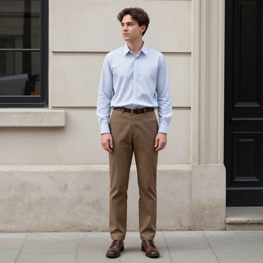 Semi Casual Attire Man Costume, young man in a shirt and brown pants standing on a sidewalk