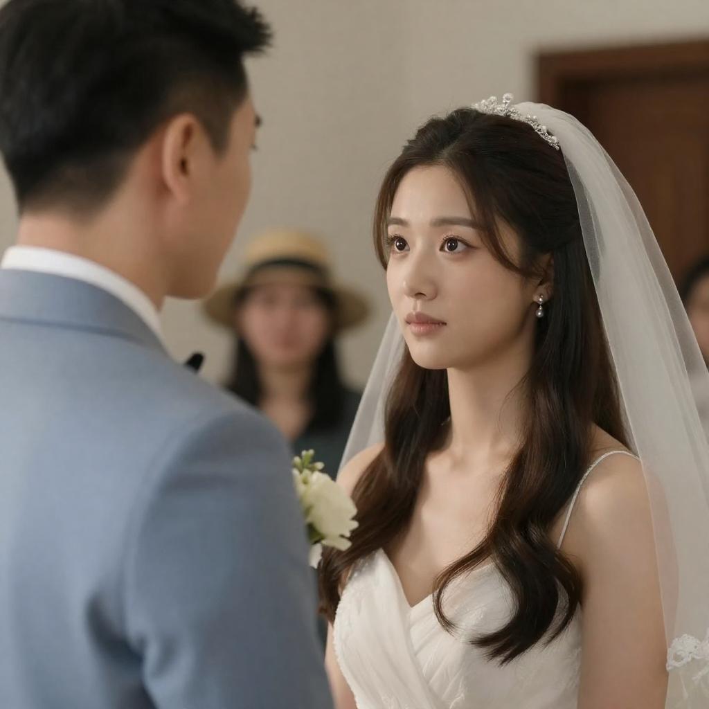 Photograph of a wedding scene showing a man in a light blue suit with a white boutonniere, facing left, and a woman with long dark hair, wearing a veil, looking forward. Soft, warm lighting highlights their profiles. Blurred background includes another person in a hat.