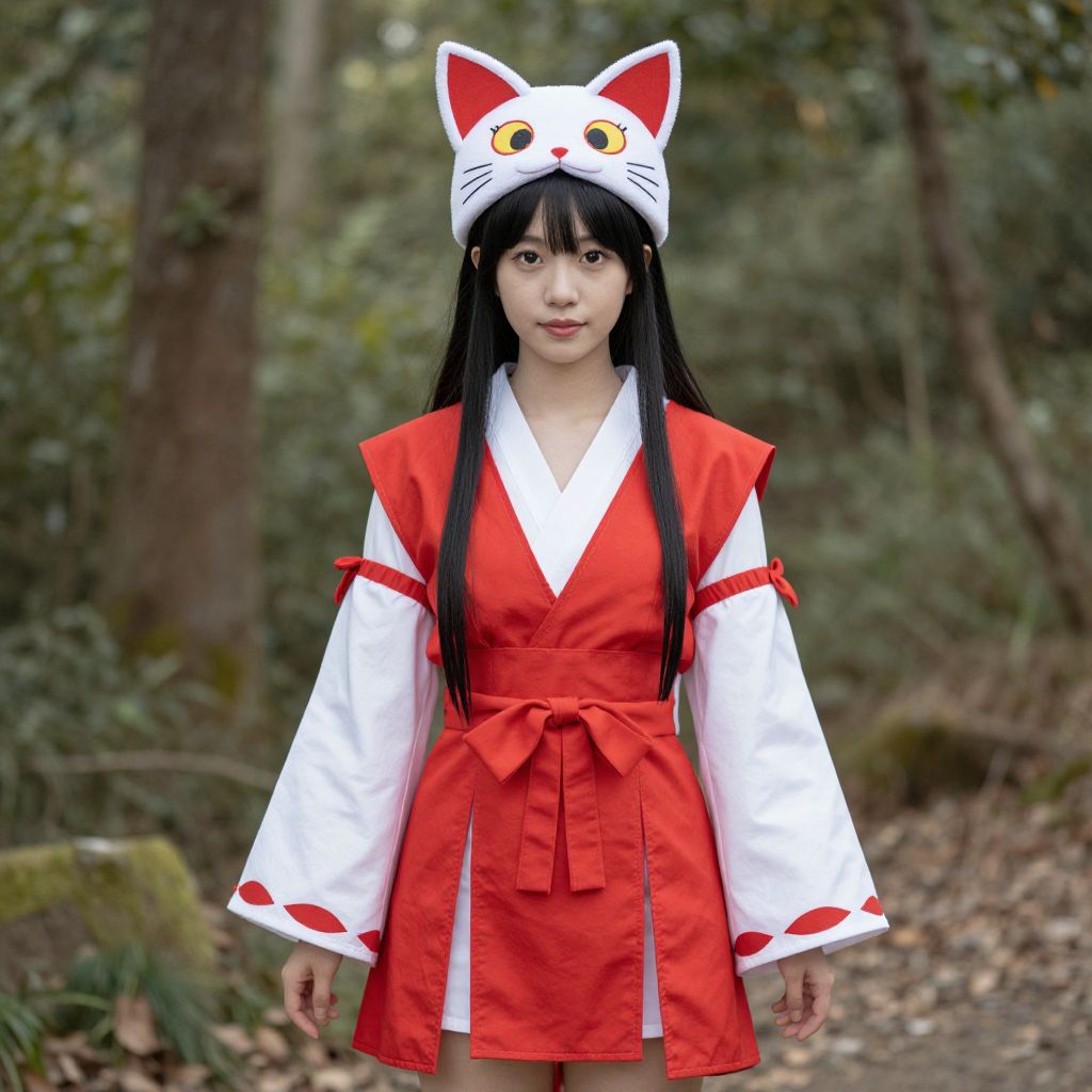Photograph of an Asian woman with long black hair, wearing a red and white cat-eared fox costume, standing in a forest.