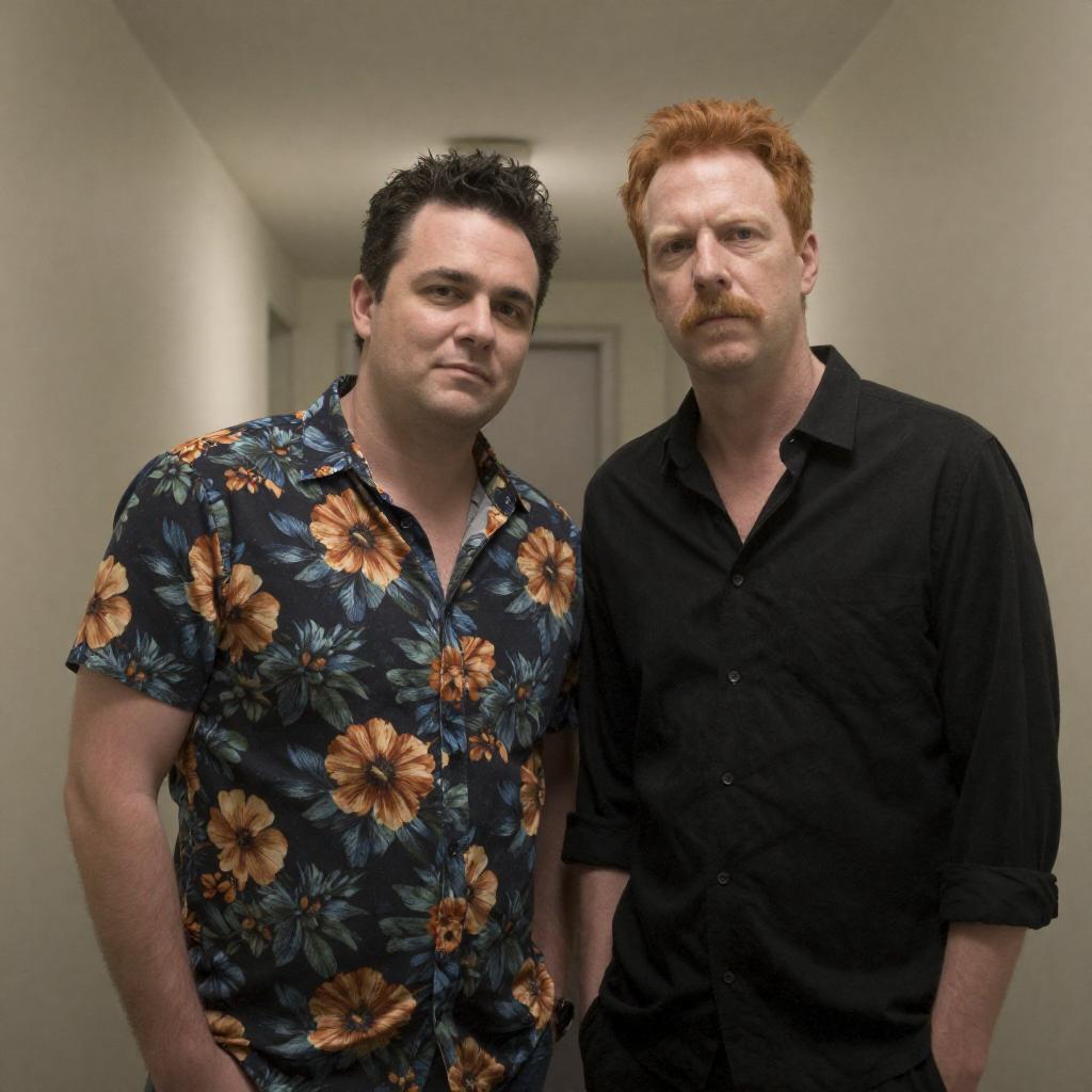 Photograph of two men in a hallway. The man on the left wears a floral shirt with blue and orange flowers, has short dark hair, and a medium build. The man on the right has red hair, a mustache, wears a black shirt, and looks serious. Both stand close together, with the man on the left leaning slightly toward the man on the right.