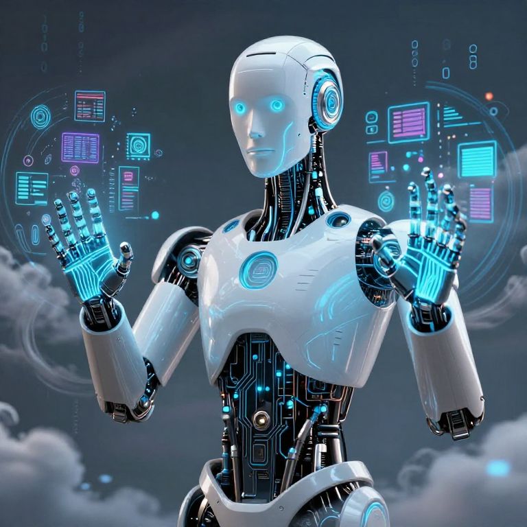 AI generatr concept art showing a humanoid robot with embedded circuitry, projecting complex data visuals from its palms, surrounded by swirling digital clouds and binary code, a blend of realism and cybernetic fantasy elements